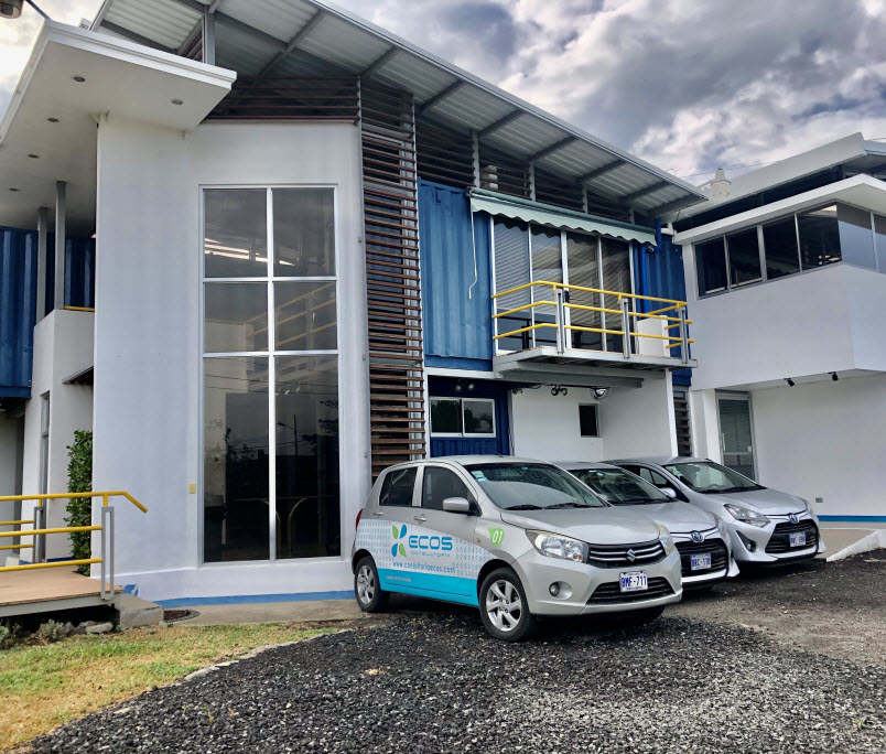 ECOS opened in 2015 its main office building in the Industrial Zone Coyol of Alajuela. The design of this property is based on environmental responsibility, its main building material are reused shipping containers, location and internal layout allows the use of natural light and ventilation to reduce electricity consumption, it has type LED lighting for energy savings and system of wastewater treatment using biological septic system free of chemicals. In the second stage it is planned to install a power generation system using solar energy collection system and storm drainage.